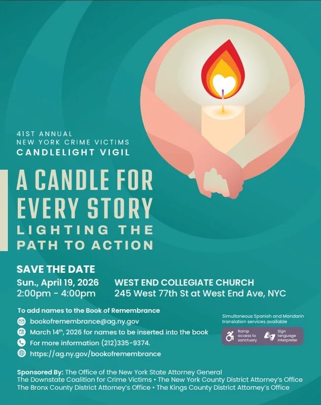 Welcome to the 41st Annual NYC Crime Victims Candlelight Vigil, a hybrid livestream and virtual event! We are in-person again this year at West End Collegiate Church on the Upper West Side and continuing our tradition of virtual celebration. We offer a special welcome to the co-sponsors of tonight’s event, the NYS Office of the Attorney General, the Manhattan, Bronx and Brooklyn District Attorney’s Offices, as well as the New York State Downstate Coalition for Crime Victims which represents NYC.